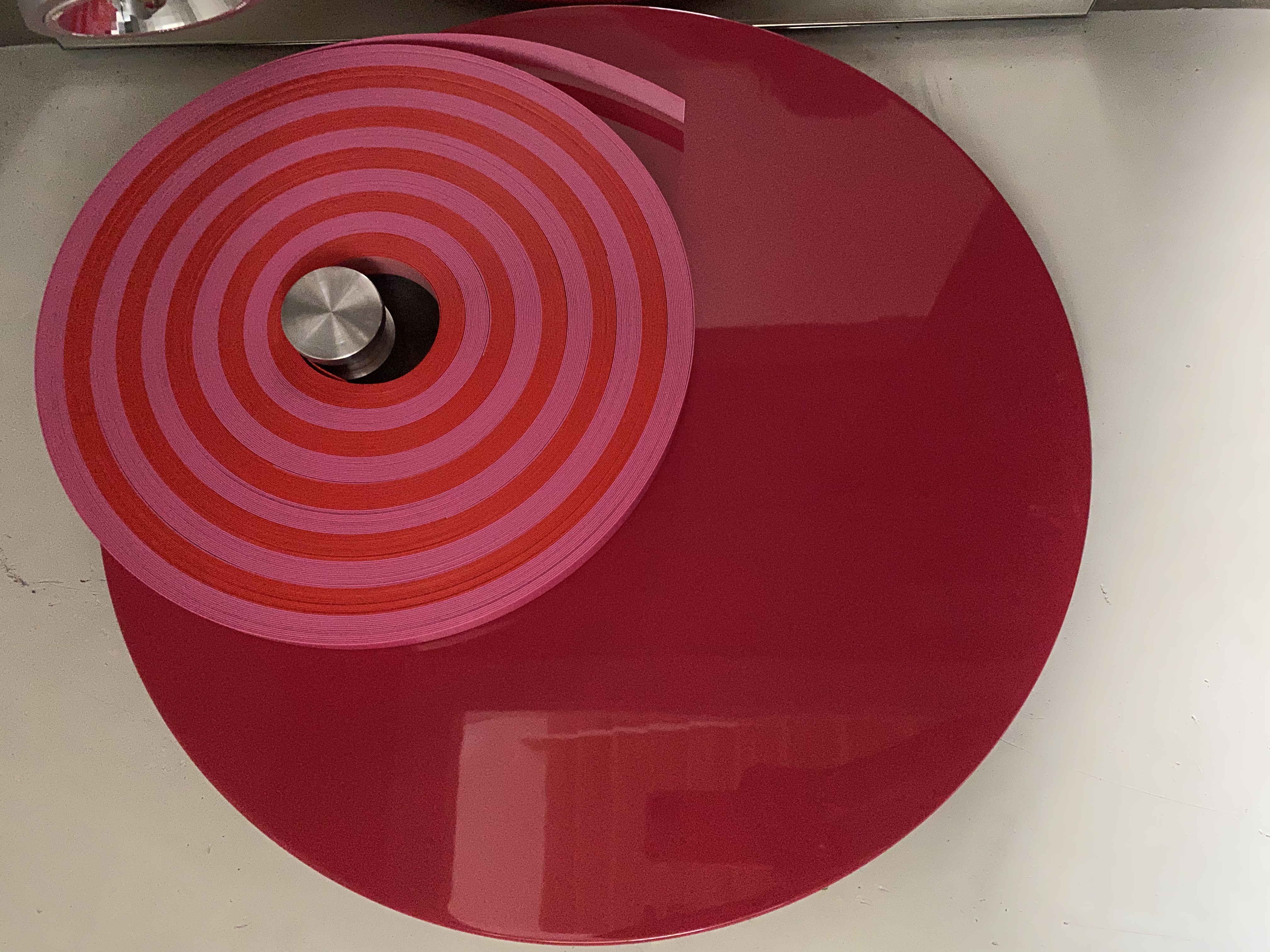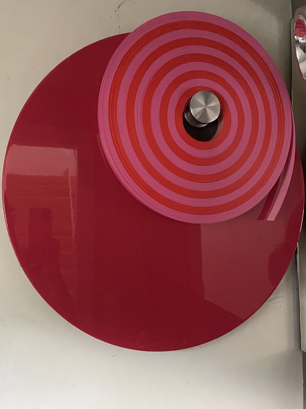 Wandinstallation aus farbigen PVC Bändern, Aluwellen und MDF-Displays